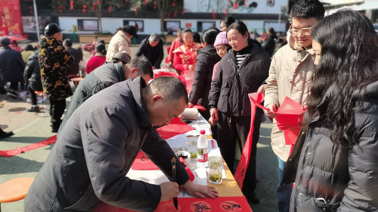 在社区广场,区三下乡工作组和黑竹镇工作组一字排开,围绕城乡居民养老保险、医疗保险、育儿补贴、扶困助残等群众高度关切的政策,通过发放宣传资料、面对面讲解,向群众解疑释惑,并以接地气的形式,提醒群众防火防诈骗等。书法志愿者们凝神挥毫、笔走龙蛇,一幅幅寓意吉祥、饱含祝福的春联跃然纸上,一张张饱满圆润的“福”字气韵生动,被群众争相领取。