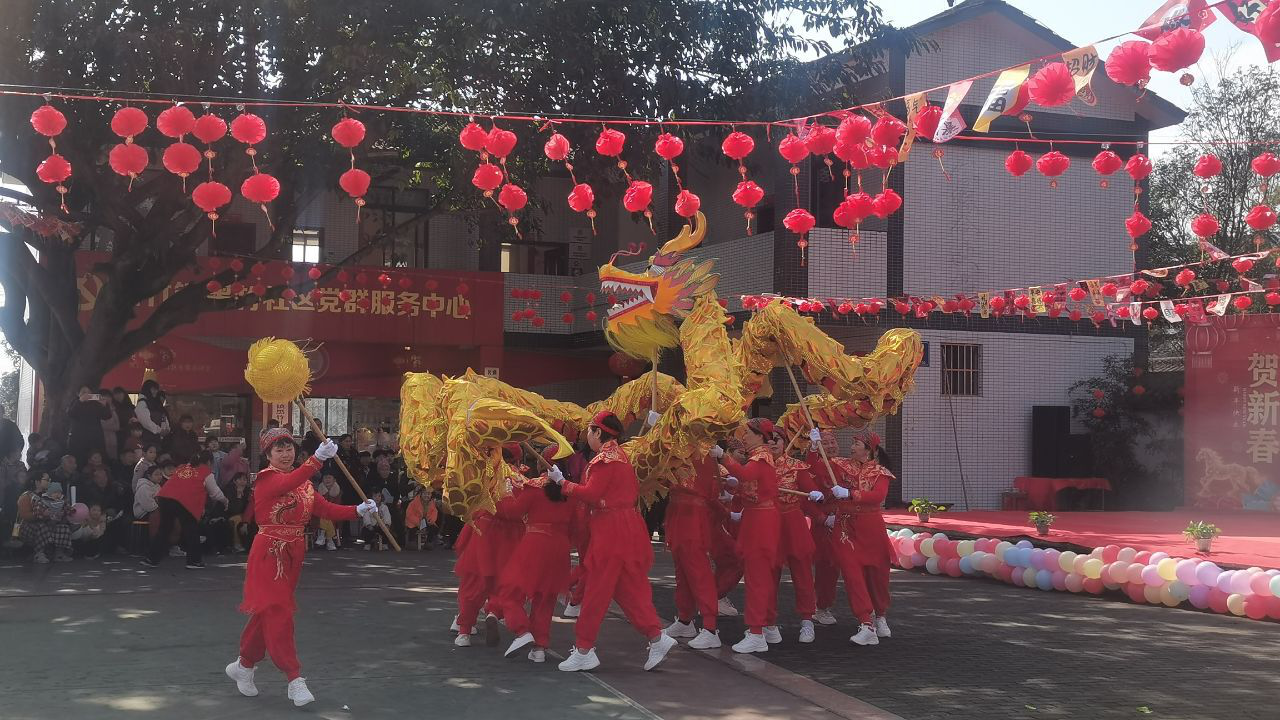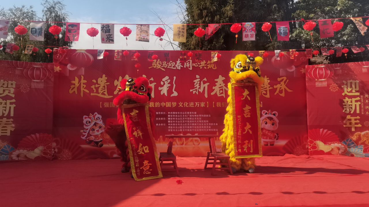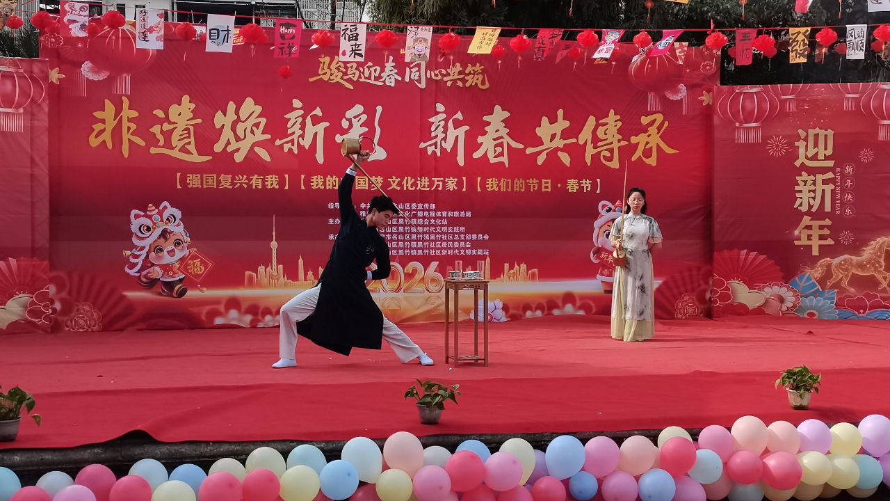 文艺汇演在舞狮舞龙表演中率先拉开序幕,演员们矫健的身姿、灵动的步伐,伴随着铿锵有力的锣鼓声,将传统民俗的热闹与活力展现得淋漓尽致;马马灯表演则以独特的唱腔和诙谐的表演,让观众重温了这一地方非遗项目的独特魅力;茶艺龙行十八式将传统武术与茶文化元素深度融合,引得现场掌声雷动,精湛的技艺让群众近距离感受到名山本土茶文化的魅力。同时,还有鼓舞《中华魂》,舞蹈《马年大吉》、《我爱你中国》等精彩节目,以新颖的艺术形式诠释了传统文化的时代内涵,展现出基层群众昂扬向上的精神风貌。